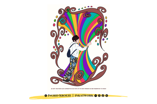 Lieve Laura beleefde een avontuur met een regenboogboom, samen met Daantje Daniël. Bij dat mooie verhaal maakte ik deze illustratie. Je hebt namelijk maar 1 klein zonnestraaltje nodig om van een donkere bui een regenboog te maken.